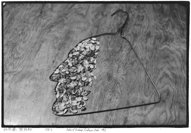 In a snapshot from another day called “Profile of Duchamp, Sunflower Seeds, 1983” he photographs a coat hanger twisted to reveal a facial profile that is placed on a wooden surface filled with sunflower seeds. Art historians will see precursors to some of his later work in this image. His huge show at the Tate in London earlier this year whereby his staff of artisans sculpted millions of sunflower seeds from porcelain to scatter on the floor is direct evidence of this connection. In 1985, when I interviewed Ai Weiwei for the Village Voice article, he was walking around with a book about Marcel Duchamp. If we look carefully at the coat hanger profile we can see it closely resembles Duchamp’s self-silhouette profile from 1958. New York based artist, Roland Flexner, who knew Ai during his New York period, reminds me that the coat hanger is also a reference to Duchamp’s coat rack called Trebuchet or Trap from 1917/1963.