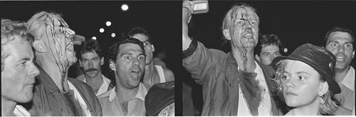 In 1988 he is also busy snapping photos of Al Sharpton at one of the Tawana Brawley marches – a complicated case that left its scars on the Black community in New York. He creates a sequence from a nightime arrest at Washington Square Park. He documents a doctor’s demonstration on behalf of AIDs patients. In Tompkins Square Park he’s also photographing the Wigstock “concert”– transvestites having fun. In a contact photo sequence of transvestites waiting to perform we see the stenciled sign “Whose Fucking Park?” and he names the sequence accordingly. His sensitivity to the range of social protest is expanding.