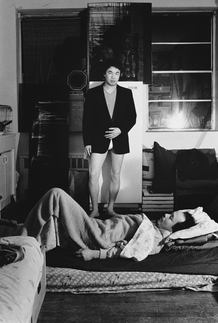 Another category — that sometimes charms — is the self-portrait. Of course, such photos have been snapped by everybody who picks up a camera to begin exploring its possibilities but is hard up for a subject – self-portraits, reflections in mirrors and objects. But here and there is a particularly arresting variation. My favorite self portrait is taken when Wang Keping – of the Star Star group – is visiting from Paris and is asleep on a mattress in the cramped East 3rdSt apartment while Weiwei is standing over him dressed in a tuxedo and underpants. He looks curiously at the camera while Keping dreams below him. It’s an interesting twist on the power dynamics of what may have been their relationship since Keping was considered the leader of the Star Star group.