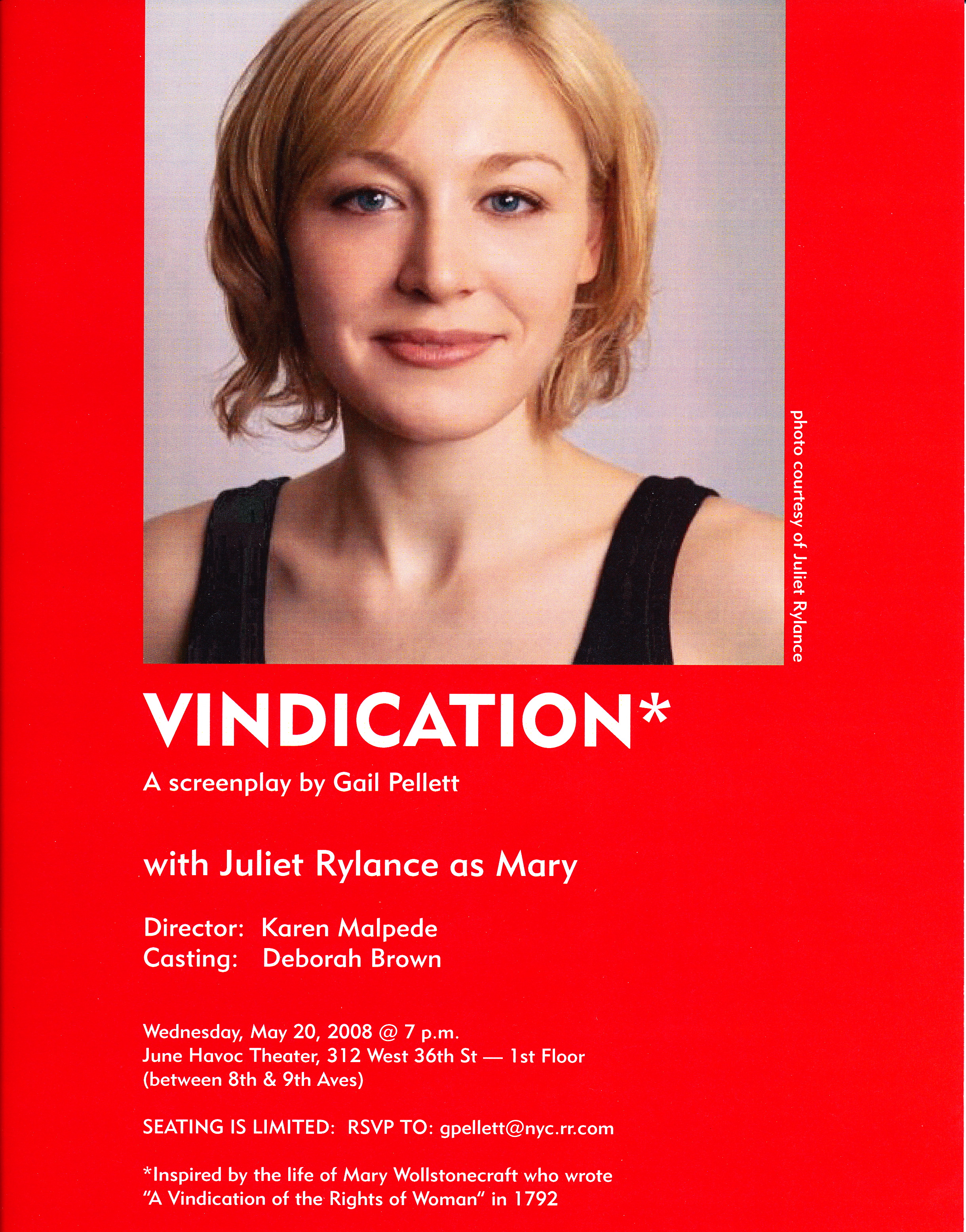 In 2009, I produced a dramatic reading of my screenplay “Vindication,” about the 18th century British feminist, Mary Wollstonecraft, with Juliet Rylance as Mary.