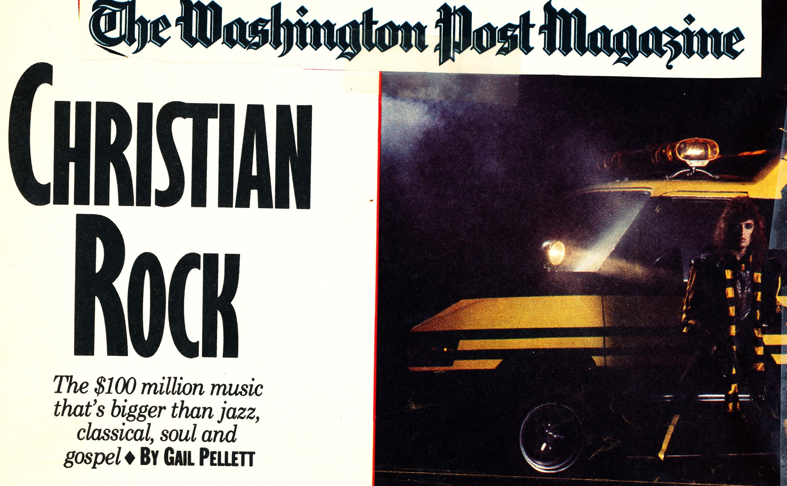 I AM DRIVING ALONG a freeway in northern New Jersey, a landscape of petrochemical time bombs. It’s late afternoon and raining. The traffic moves like sludge. I search the AM only dial on my rental car and hit on a heavy funk up-tempo beat with a woman’s husky belting, the lyrics drowning in layers of good-time rock. The DJ says something about Bonnie Bramlett and I feel thrilled that old familiar rock names are still stirring my juices. A heavy-metal band begins, guitars careen and buzz, rhythms crash around me, evoking Led Zeppelin (if you’re over 25) or Iron Maiden (if you’re not), Voices shriek beneath dozens of track overlays and I’m relieved when the final bars segue into a new wave piece. Now a woman’s punky voice drones pleasantly above the tantalizing beat. She sing-talks something about privatized lives so I remember to listen for her name. The perky DJ yodels that this is Sheila Walsh, the hottest Christian singer in England. We’re listening to Top 40 Christian rock radio, Hackensack, N.J.