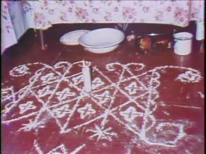 We watch as  Lola and Maggie prepare for a ceremony or party for the spirits.  They decorate their house much like you would prepare for a birthday party.  The dining table is spread with cakes and cookies, grapes and watermelon, candles and objects that they believe the saint enjoys.  Streamers are strung across the ceiling.  Lola anoints the space with her asson — her sacred beaded rattle.   On her lineoleum floor she draws a veve — a symbol for the saint who is being celebrated and called upon here.  It’s all a far cry from a hounfor or vodou temple in Haiti on a dirt floor with its sacred pole at the center around which veves are usually drawn and the ceremony with its dancing and possession take place.